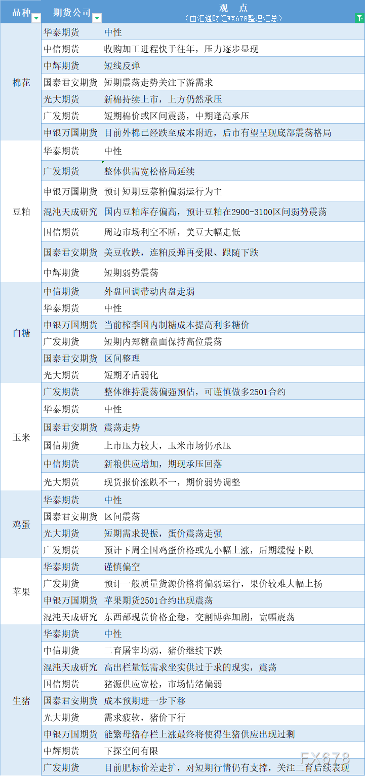 汇通财经APP讯——期货公司观点汇总一张图:10月9日农产品(棉花、豆粕、白糖、玉米、鸡蛋、生猪等)