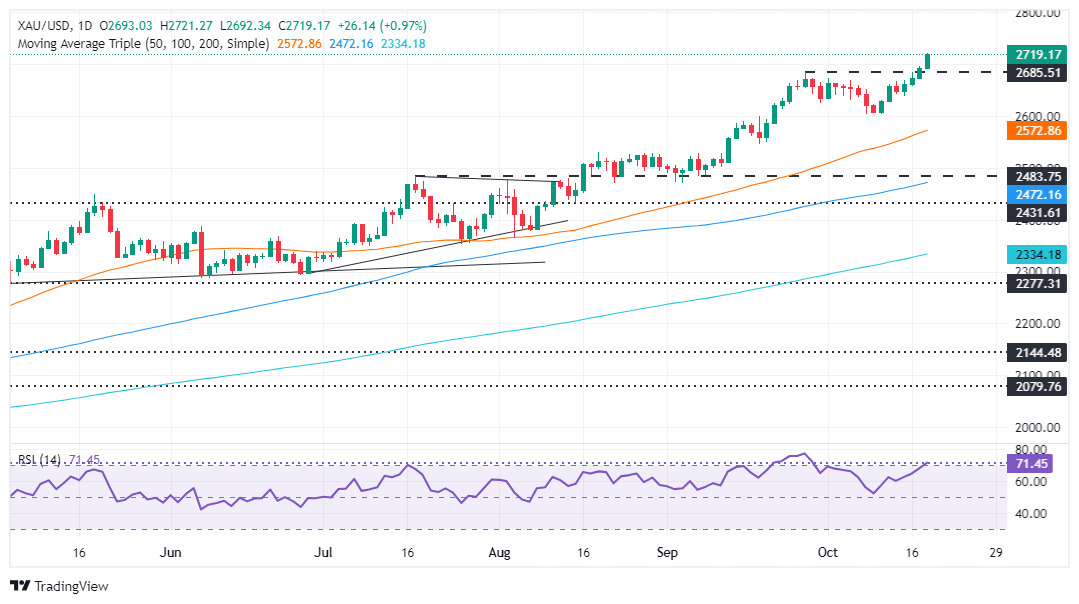 Valencia指出,黄金价格的涨势依然完好无损。正如相对强弱指数(RSI)所描绘的那样,势头支持多头,该指数飙升并转为超买,但没有盘整的迹象。在这种背景下,黄金阻力最小的路径是上行。