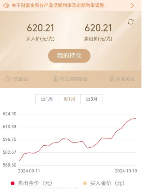 在10月之前,中行、建行、农行和兴业、招商、浙商银行等也相继发布公告,宣布上调积存金起购点,调整后的最小购买金额为650元—700元不等。