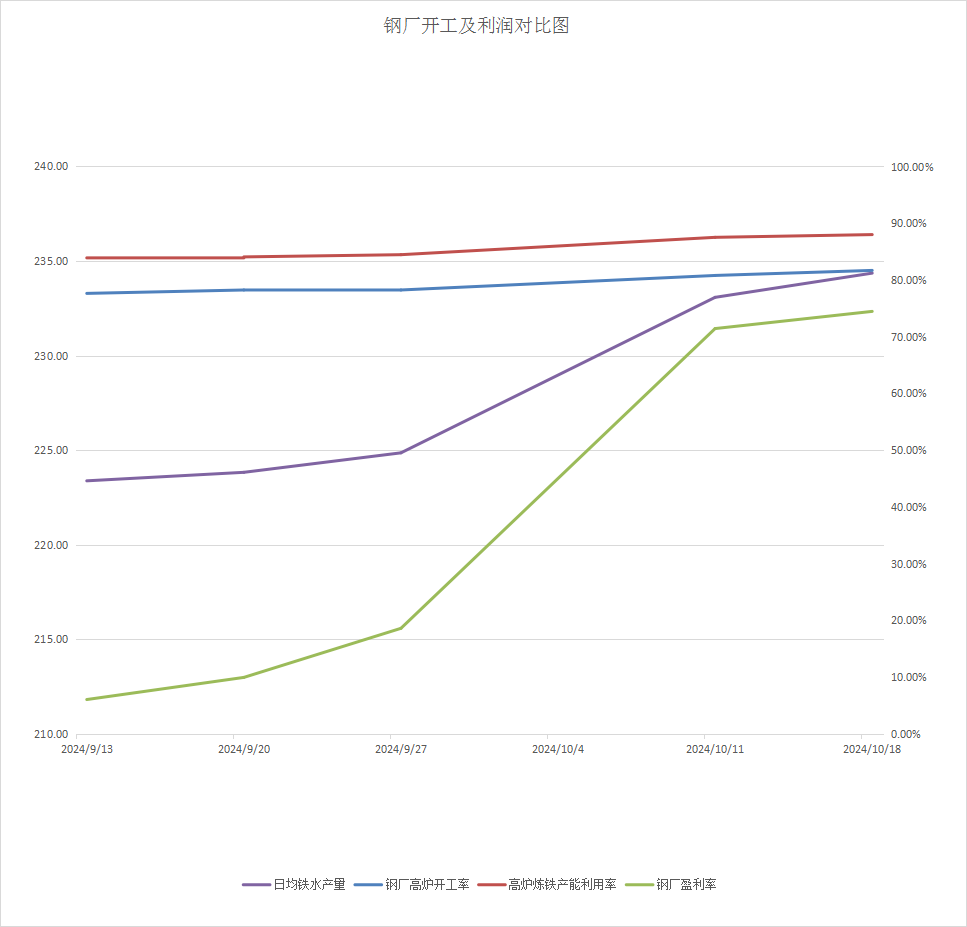 需求方面,截至10月21日,钢厂高炉开工率81.68%,周环比上升0.89%;高炉炼铁产能利用率87.99%,环比上升0.48%;钢厂盈利率74.46%,环比增加3.03%;日均铁水产量234.36万吨,环比增加1.28万吨;当前样本钢厂的进口矿日耗为288.92万吨,环比增加0.77万吨。上周钢厂开工情况、铁水产量维持增长趋势。上周下游钢材行情有所回落,而铁矿价格下行后钢厂生产利润有所恢复,高炉生产操作增加,铁矿需求释放预增。随着钢厂利润水平恢复,据上周钢厂停复产计划来看,本周复产量多于检修量,本周钢厂采购幅度预增,预计本周铁矿需求释放有所增加。