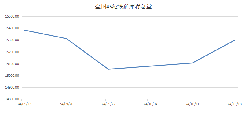库存方面,截至10月18日,全国45个港口进口铁矿库存为15297.53万吨,环比增加191.6万吨;日均疏港量为325.9万吨,周环比增加0.89万吨;在港船舶数114条,与上周相比减少13条。上周铁矿港口库存情况如上图;全国钢厂进口铁矿库存总量为9006.73万吨,周环比增加21.43吨。上周港口疏港量增量放缓,港口库存继续回增。随着钢厂生产操作持续进行,对疏港量存有支撑,加上上周海外发运缩减,港口库存有去库可能,本周仍需要多关注港口铁矿库存变化。