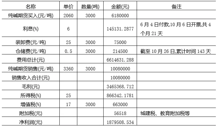 7月之后,纯碱现货价格及期货价格均呈大幅上涨趋势。时至9月,随着光伏玻璃投产不及预期、纯碱产量的稳步恢复以及交割库库存的逐步累积,该玻璃企业判断此后纯碱价格存在降价可能。另外,9月中旬纯碱基差出现低于正常区间的情况,后期基差走强的可能性较大,为规避纯碱原料库存价格下跌的风险,9月底,该玻璃企业决定将多余的3000吨纯碱原料以3360元/吨的价格在期货市场上卖出,遂建立SA2210合约空头持仓并持有至到期进行交割,盘面获利情况如表2所示。