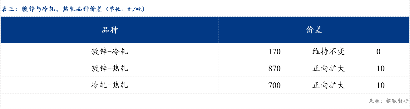 今日冷轧板卷乐从与天津价差较上一交易日扩大20元/吨,乐从与上海价差较上一交易日收窄10元/吨;镀锌板卷乐从与天津价差较上一交易日扩大20元/吨,与上海价差较上一交易日扩大20元/吨。品种价差方面,镀冷价差较上一交易日持平,镀热价差较上一交易日扩大10元/吨,冷热价差较上一交易日扩大10元/吨。
