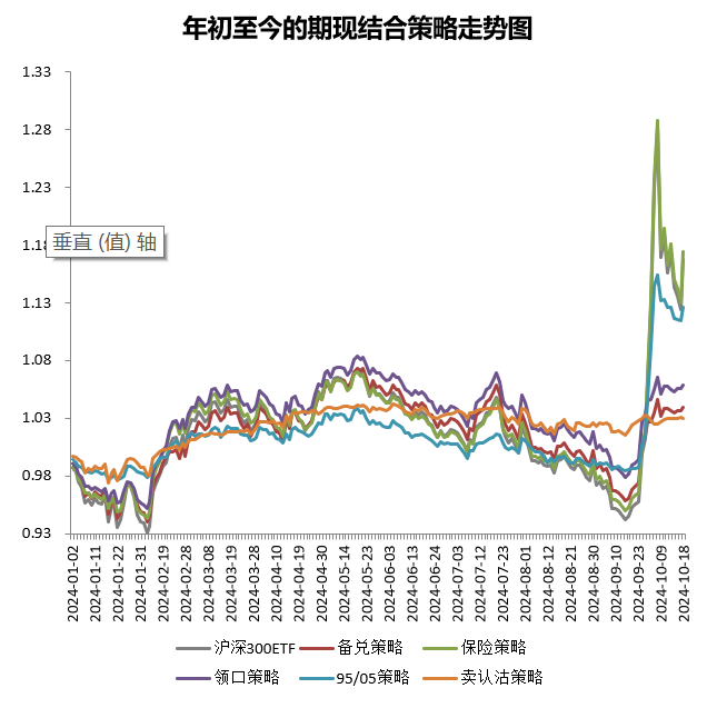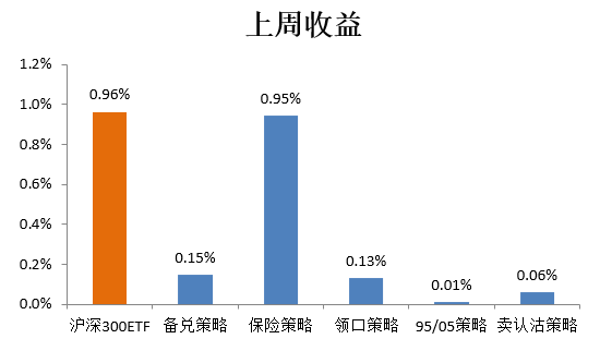 我们对期现结合的五个策略(备兑、保险、领口、95/05配置、卖认沽)及沪深300ETF现货,在上周(2024.10.14-2024.10.18)的表现进行了回测。上周沪深300ETF上涨,保险策略、领口策略、卖认沽策略所涉认沽期权已深度虚值。具体结果如下: