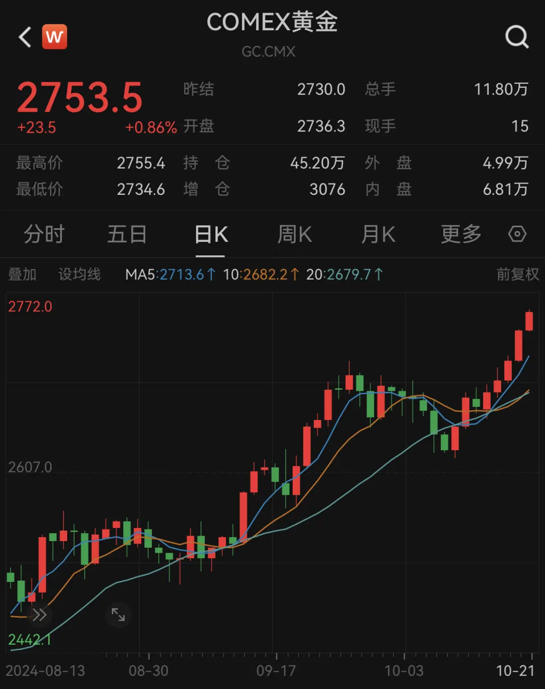 夜盘时间,国内黄金期货价格开盘继续上涨。国际黄金期货方面,截至北京时间21:00,COMEX黄金期货价格再创新高,报2753美元/盎司。