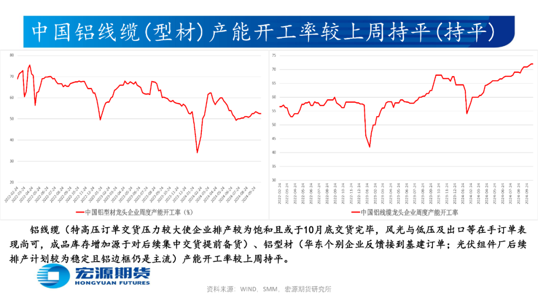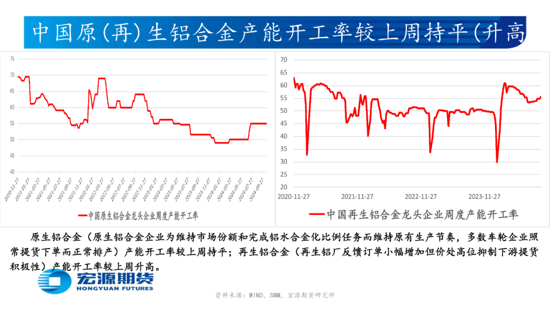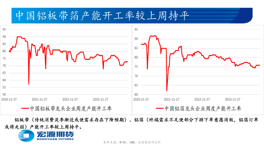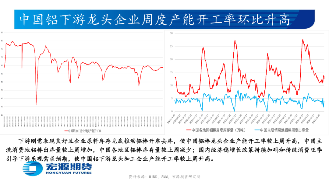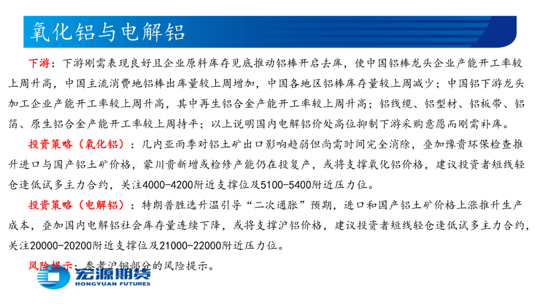 下游刚需表现良好且企业原料库存见底推动铝棒开启去库,使中国铝棒龙头企业产能开工率较上周升高,中国主流消费地铝棒出库量较上周增加,中国各地区铝棒库存量较上周减少;中国铝下游龙头加工企业产能开工率较上周升高,其中再生铝合金产能开工率较上周升高;铝线缆、铝型材、铝板带、铝箔、原生铝合金产能开工率较上周持平;以上说明国内电解铝价处高位抑制下游采购意愿而刚需补库。