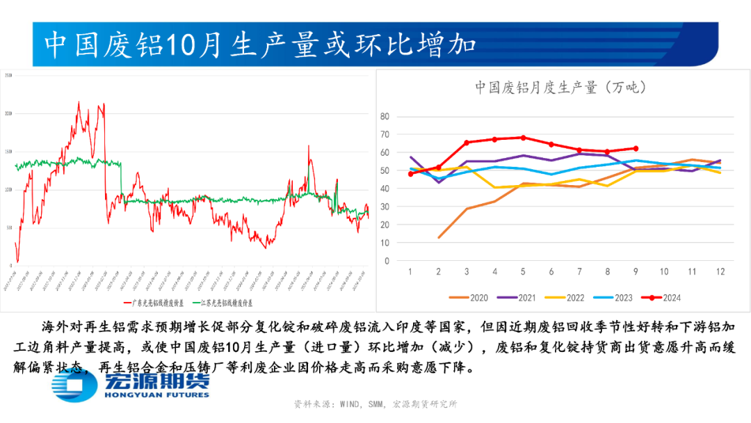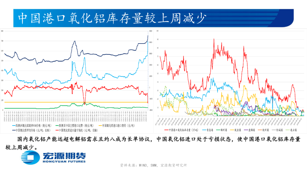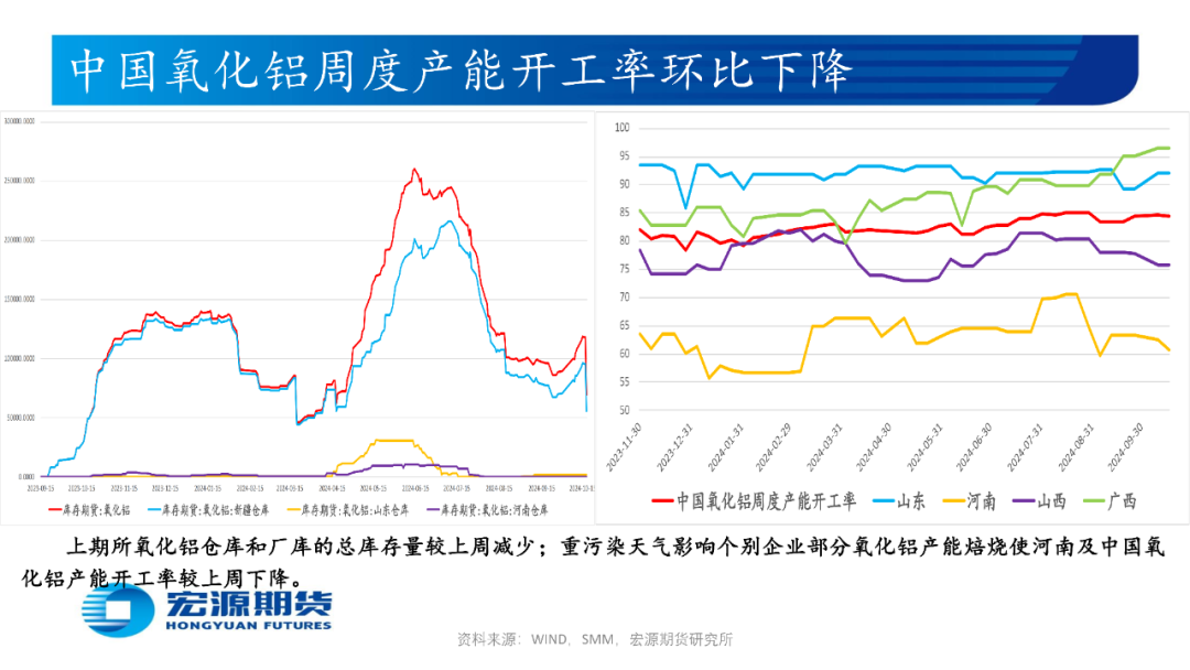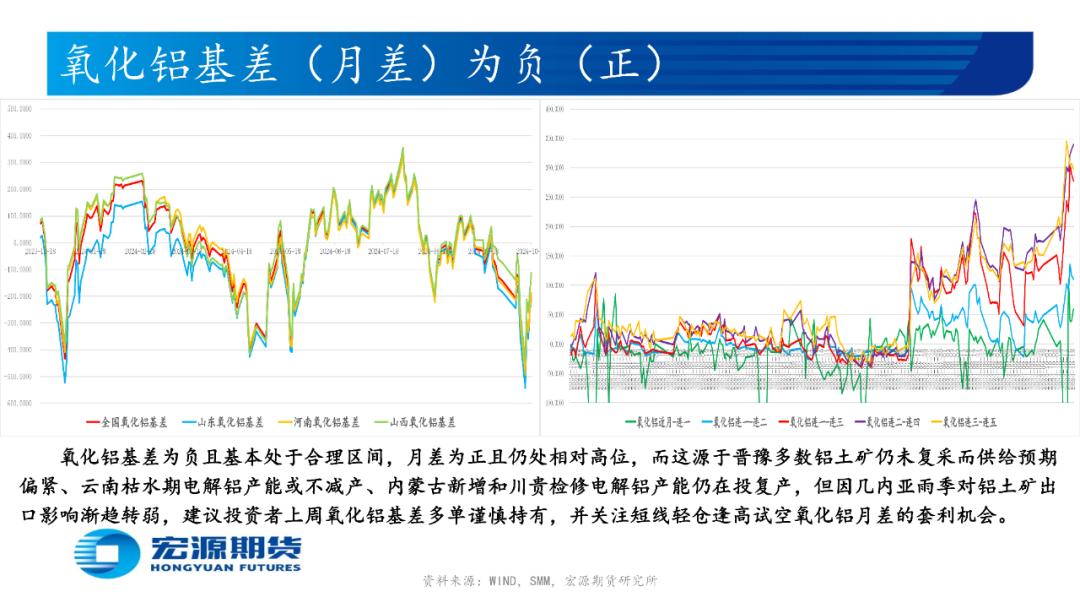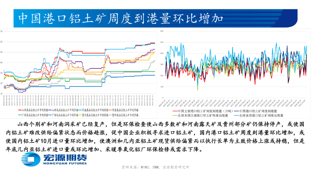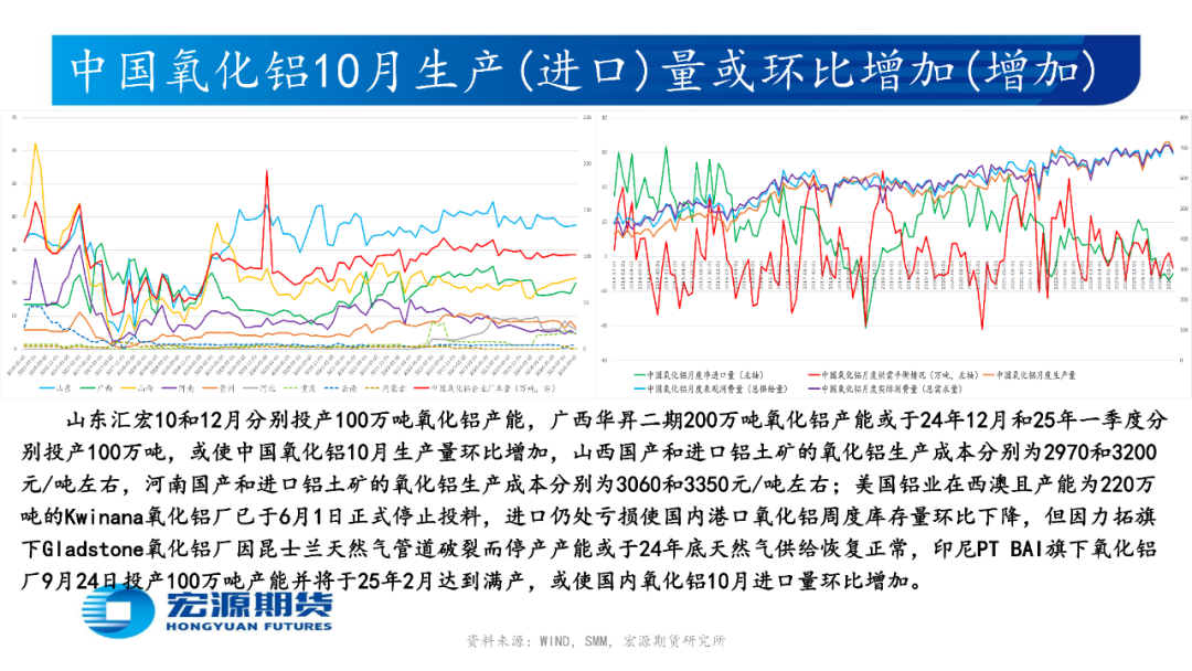 山东汇宏10和12月分别投产100万吨氧化铝产能,广西华昇二期200万吨氧化铝产能或于24年12月和25年一季度分别投产100万吨,或使中国氧化铝10月生产量环比增加,山西国产和进口铝土矿的氧化铝生产成本分别为2970和3200元/吨左右,河南国产和进口铝土矿的氧化铝生产成本分别为3060和3350元/吨左右;