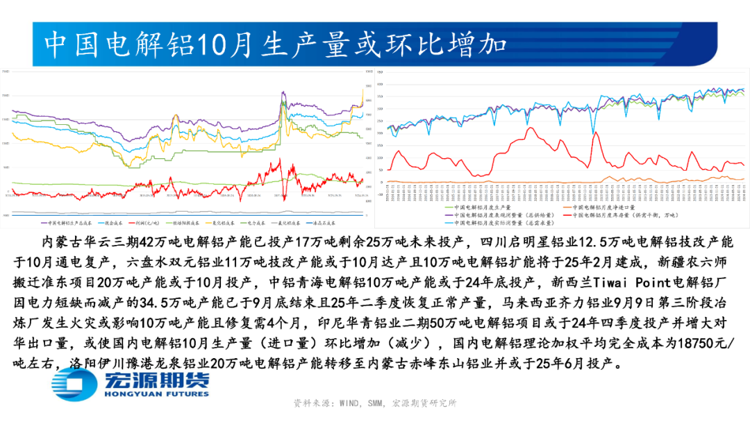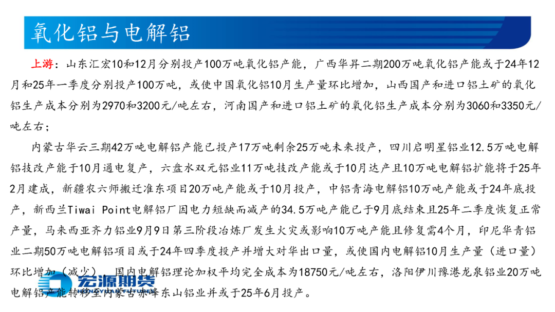 内蒙古华云三期42万吨电解铝产能已投产17万吨剩余25万吨未来投产,四川启明星铝业12.5万吨电解铝技改产能于10月通电复产,六盘水双元铝业11万吨技改产能或于10月达产且10万吨电解铝扩能将于25年2月建成,新疆农六师搬迁准东项目20万吨产能或于10月投产,中铝青海电解铝10万吨产能或于24年底投产,新西兰Tiwai Point电解铝厂因电力短缺而减产的34.5万吨产能已于9月底结束且25年二季度恢复正常产量,马来西亚齐力铝业9月9日第三阶段冶炼厂发生火灾或影响10万吨产能且修复需4个月,印尼华青铝业二期50万吨电解铝项目或于24年四季度投产并增大对华出口量,或使国内电解铝10月生产量(进口量)环比增加(减少),国内电解铝理论加权平均完全成本为18750元/吨左右,洛阳伊川豫港龙泉铝业20万吨电解铝产能转移至内蒙古赤峰东山铝业并或于25年6月投产。
