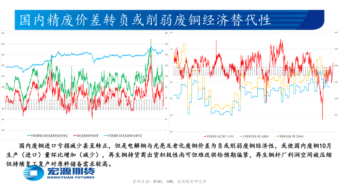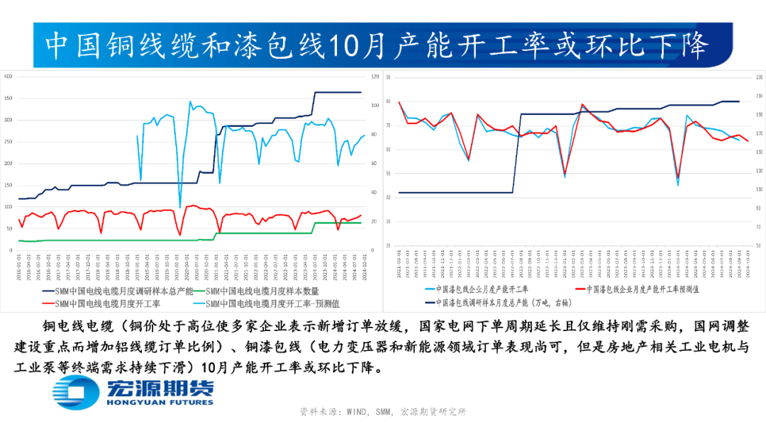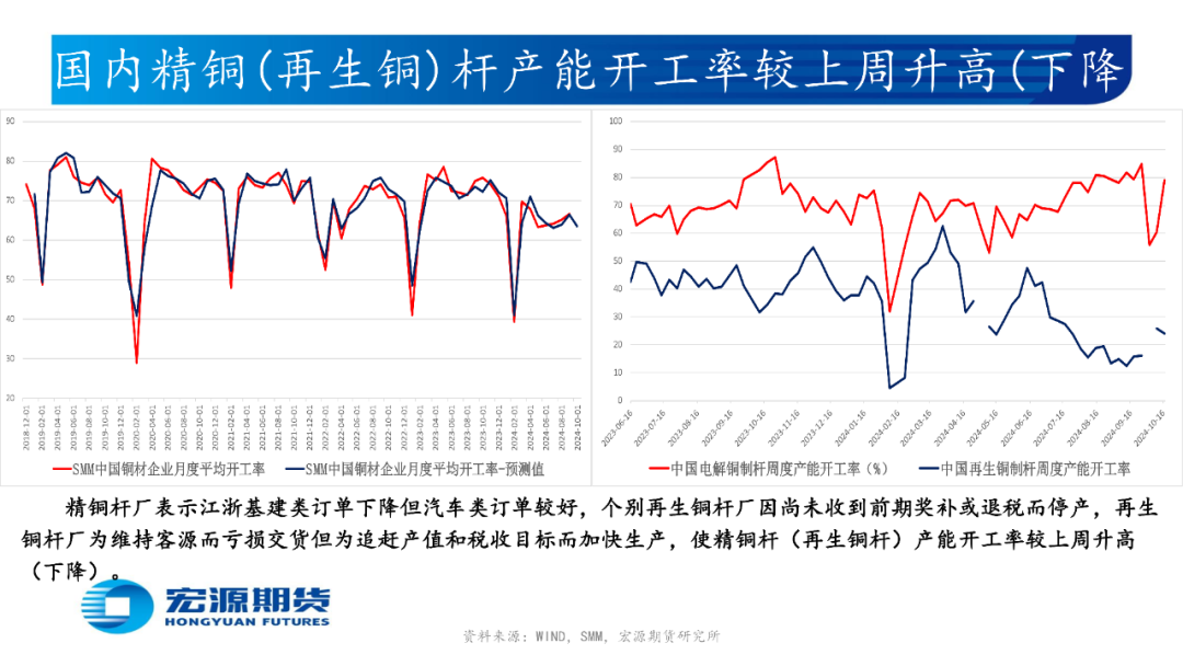 精铜杆厂的江浙基建订单下降但汽车订单较好,再生铜杆厂为维持客源而亏损交货但为追赶产值和税收目标而加快生产,使精铜杆(再生铜杆)产能开工率较上周升高(下降);国内经济稳增长政策持续加码但因传统消费淡季渐趋临近,或使10月铜材企业产能开工率环比下降,具体而言:电解铜制杆、铜电线电缆、铜漆包线、铜板带、铜箔产能开工率或环比下降;再生铜制杆、铜管、黄铜棒产能开工率或环比升高。