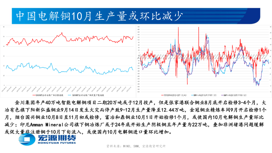 金川集团年产40万吨智能电解铜项目二期20万吨或于12月投产,但是张家港联合铜业8月底开启检修3-4个月,大冶有色旗下阳新弘盛铜业9月14日发生火灾而停产致9-12月生产量降至12.44万吨,烟台国兴铜业10月8日至11月初或检修,富冶和鼎铜业10月1日开始检修1个月,或使国内10月电解铜生产量环比减少;非洲堵港问题缓解或促大量非注册铜于10月下旬流入,叠加南美注册铜发货增加,或使国内10月电解铜进口量环比增加。
