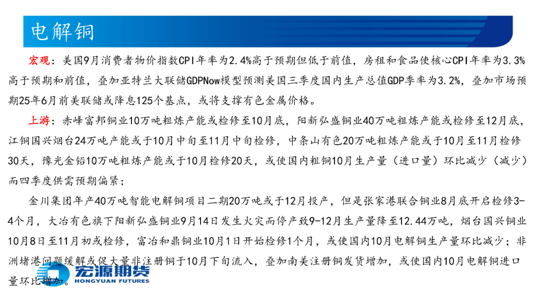 美国9月消费者物价指数CPI年率为2.4%高于预期但低于前值,房租和食品使核心CPI年率为3.3%高于预期和前值,叠加亚特兰大联储GDPNow模型预测美国三季度国内生产总值GDP季率为3.2%,叠加市场预期25年6月前美联储或降息125个基点,或将支撑有色金属价格。
