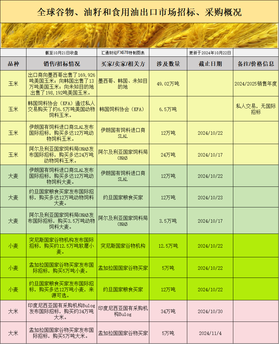 全球谷物、油籽和食用油出口市场招标、采购概况: