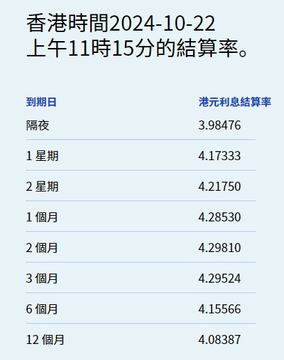 10月22日,港元拆息全线向下,其中,隔夜拆息跌20.429基点,报3.98476%,连跌六天,而与楼按相关的一个月拆息回落,报4.2853%,跌2.964基点,创逾三周低。