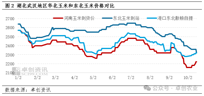 以湖北武汉为例,截止到10月21日,武汉地区通辽新玉米到库价格2340-2350元/吨,河南色选袋装玉米到库2260-2300元/吨,东北粮较河南玉米价格高50-80元/吨,较10月10日价差下降80元/吨左右。随着价差缩小,且东北玉米的质量优势明显,华北玉米成交量或下降。