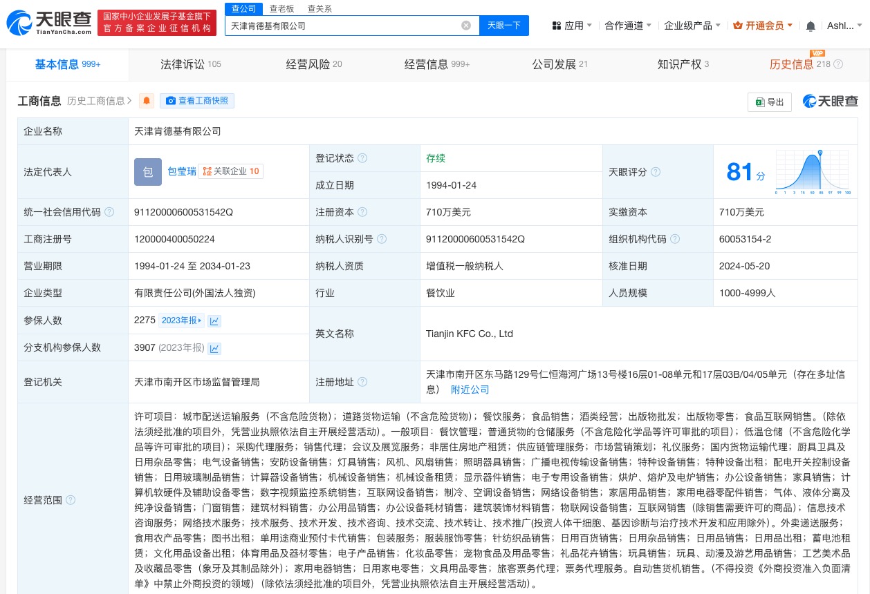 天眼查App显示,天津肯德基有限公司成立于1994年1月,法定代表人为包莹瑞,注册资本710万美元,经营范围含餐饮服务、食品销售、城市配送运输服务、餐饮管理等,由百胜(中国)投资有限公司全资持股。分支机构信息显示,该公司拥有940余家分支机构,其中760余家为存续状态,分布在天津、河北、内蒙古等地。值得注意的是,该公司在天津拥有350余家分支机构,其中240余家为存续状态。
