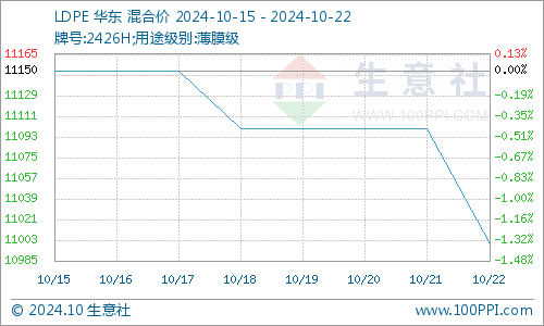 据生意社商品行情分析系统监测,LDPE(2426H)10月15日国内价格在11150元/吨,10月22日均价在11000元/吨,期间报价下跌1.35%。