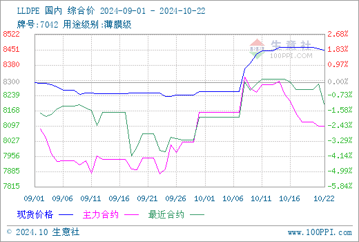 据生意社商品行情分析系统监测,LLDPE(7042)10月15日国内价格在8463元/吨,10月22日均价在8450元/吨,期间报价下跌0.16%。