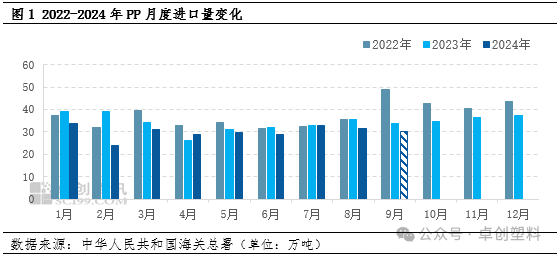 进入3季度以来,PP进口体量先增后降,7月份仍有前期部分远月货源到港叠加新月货源,进口量较6月有所增加,而后随着旺季前备货需求不及预期以及成本端支撑松动,国内价格持续下行,海外供应商对华报盘热情下降,进口市场降温。