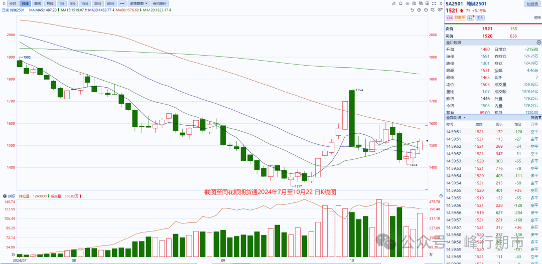 截止10月22日收盘,纯碱主力合约收1521元/吨,收涨5.19%。受到减产消息的影响,日内呈现强势状态。