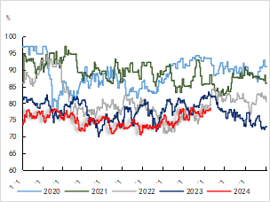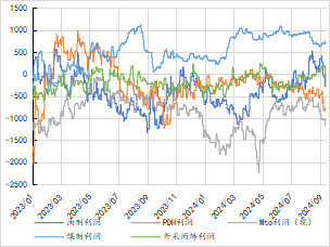 截至9月30日,PE、PP油制利润分别在1055元/吨、405元/吨,聚烯烃利润的扩张主要得益于国际油价的下跌带动,利润被动扩张。从四季度开始,原油的供应将逐步增加,按照当前的数据测算11月份开始全球预计出现原油供应过剩,叠加美国大选年份打压油价达到降低通胀的需求,四季度布伦特原油的价格区间或将下调至75-80美元/桶附近,预计油制利润会随着原油价格中枢的继续下移而被动扩张。