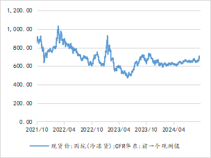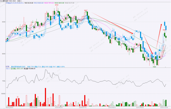 2024年三季度,聚烯烃价格先跌后涨,整体收跌为主。7月份开始聚烯烃盘面价格大幅下跌,双双跌破今年以来的上涨趋势,市场情绪悲观。从驱动来看,基本面7月份开始转弱,虽然时有意外检修装置的扰动,但PP、PE开工率的大方向仍是确定向上的,需求在淡季下变化不大,因此可以看到上游库存压力开始增加,价格疲软。此外,原油价格的大幅下跌,给出了聚烯烃价格下跌的空间,叠加宏观预期转弱,工业品指数大幅下跌,PP、PE跟随大幅走弱。8月下旬开始,原油价格开始反弹,且市场上PP、PE标品比较紧张,交割逻辑占主导下,对盘面价格形成支撑,且“金九银十”也逐渐临近,下游需求开始改善,因此盘面价格企稳反弹,不过此后又开始下跌。9月底,随着央行发布会宣布的利好政策出台,市场情绪逐渐修复,叠加节假日前下游的补库需求,多重利好下价格开始企稳回升。