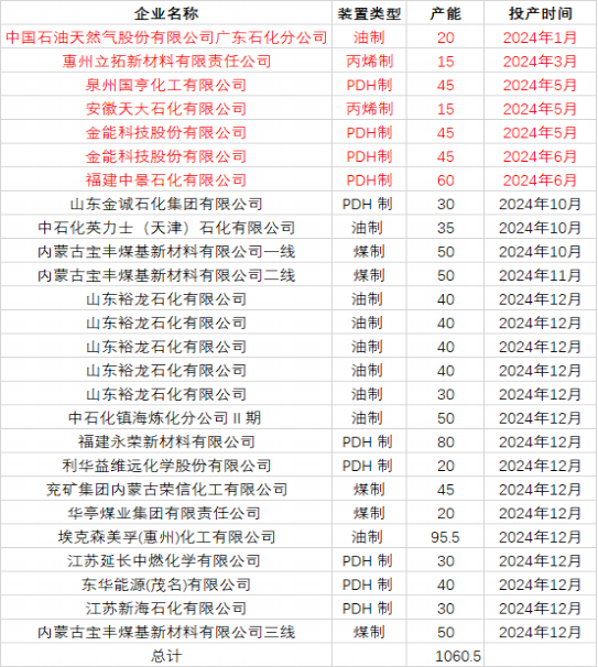 根据隆众资讯数据显示,2024年PE、PP共计划投产分别为395万吨、1060.5万吨,截至3季度末,实际投产情况为PE投产30万吨、PP投产245万吨,截至目前,PE产能在3271万吨,PP产能在4181万吨。