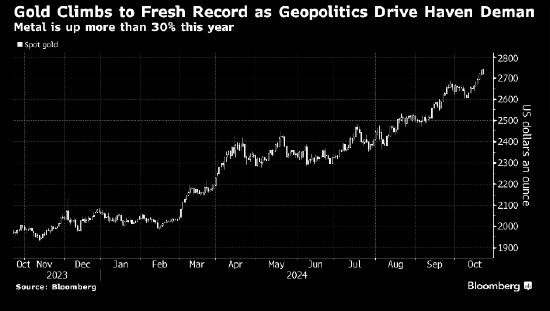 金价触及每盎司2742.08美元的历史高点,刷新了周一创下的纪录。美国总统大选势均力敌,而且人们一直担心中东的冲突可能升级为更广泛的战争,都促使交易员纷纷涌入黄金市场。