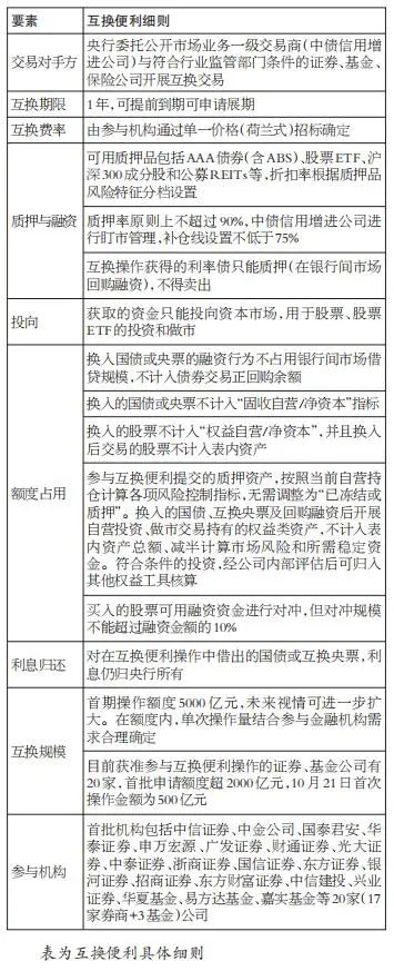 10月10日,央行公告称,创设首期规模5000亿元互换便利,支持资本市场发展。10月18日,业务流程、操作要素、交易双方权利义务等细则出炉。10月21日,央行公告称,开展了证券、基金、保险公司互换便利首次操作。随后,中金公司认领互换便利项下首笔质押式回购交易。10月22日,该公司在互换便利项下首次买入股票。央行向非银机构置换权益资产的同时提供国债、央票等高流动性资产,如此一来,互换便利操作便涉及股票和债券等市场。近日,互换便利的开展对股市和债市会产生怎样的影响受到市场热议。