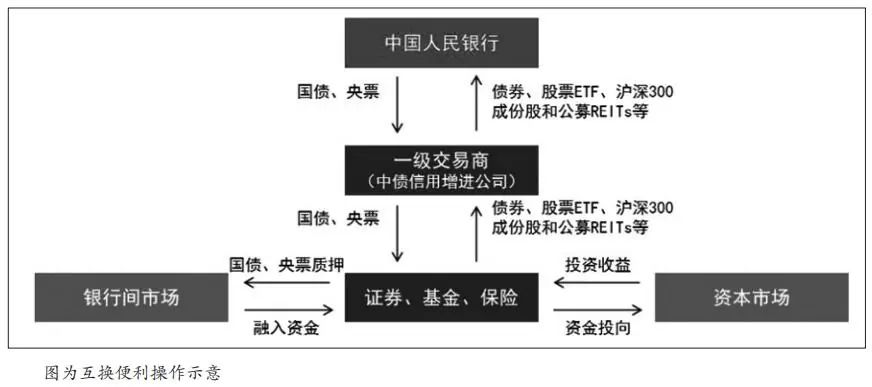 简单来说,互换便利采用“以券换券”的操作模式,主要有三个步骤:第一步,以公开市场业务一级交易商中债信用增进公司为中介,机构以其持有的流动性较差的AAA债券、股票ETF、沪深300成分股和公募REITs等资产为抵押,从央行换入国债或央票,期限为1年;第二步,机构用换入的国债或央票在银行间回购融资;第三步,机构用融到的资金开展自营和做市,只能用于股票、股票ETF的投资和做市。