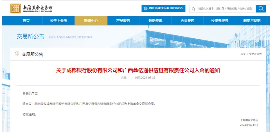 近日,上海黄金交易所官网发布公示,成都银行正式成为上海黄金交易所特别会员,成为四川省内首家、全国第七家获取此资格的城市商业银行。