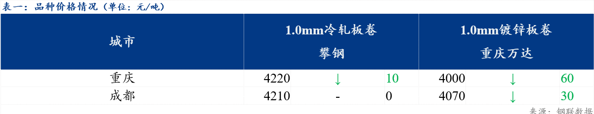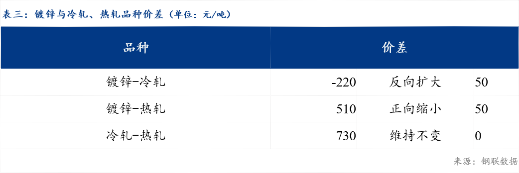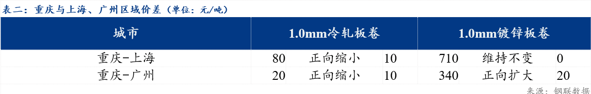 重庆、上海地区冷轧板卷区域价差缩小10元/吨,重庆、广州冷轧板卷区域价差缩小10元/吨;重庆、上海镀锌板卷区域价差维持不变,重庆、广州镀锌板卷区域价差扩大20元/吨。镀锌、冷轧品种价差反向扩大50元/吨;镀锌、热轧品种价差缩小50元/吨;冷轧、热轧品种价差维持不变。