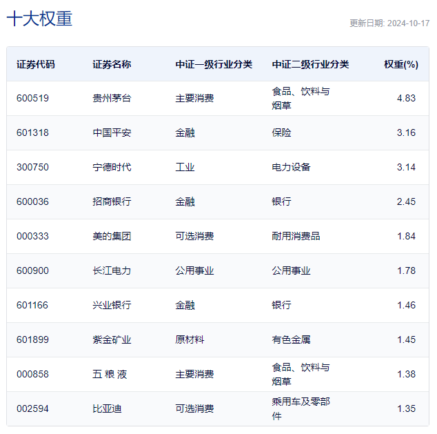 其实这些前10大成分股,市值均在4000亿元(截至2024年10月17日)以上,可以说是各行各业的绝对龙头了。