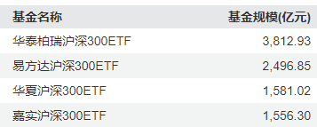 数据显示,目前跟踪沪深300的ETF合计30余只,其中有4只规模超千亿(元)。