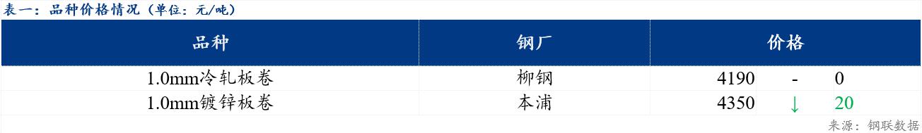 冷轧方面,今日期货热卷窄幅震荡运行,现货市场价格较上一交易日多持平,目前市场主流资源成交多集中在4160元/吨。据悉,当前终端客户多观望,采购以刚需为主,商家在库存压力不大且期货企稳的情况下也是稳价出货为主,日内成交尚可。镀锌方面,今日期货热卷盘面小幅下跌,现货市场成交氛围偏少,商家只好继续下调报价,但整体成交依旧不理想。整体来看,预计明日乐从市场冷轧及镀锌板卷价格或将暂稳运行。
