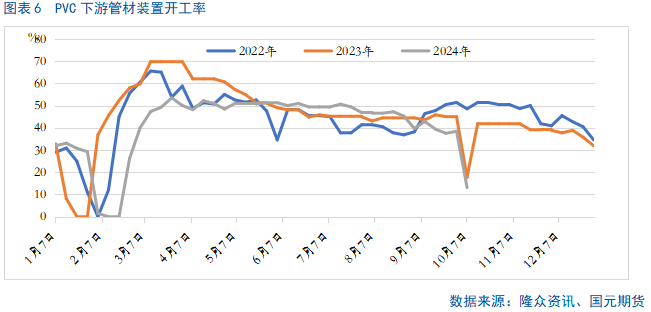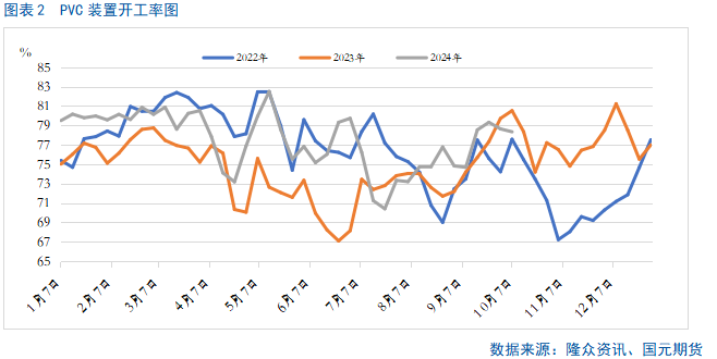 国庆节前,由于下游市场已提前完成备货,因此国内PVC生产企业产能利用率环比下滑0.68个百分点,至78.64%,较去年同期收窄0.25个百分点,但远高于2022年同期。而国庆节期间,由于部分企业降负,导致装置开工率持续收窄。据统计,截至10月4日,国内PVC生产企业产能利用率达到78.34%。其中,电石法的产能利用率达到74.91%,而乙烯法产能利用率达到60.76%。虽然乙烯法装置开工率达到近几年同期低位,但是电石法的装置开工率基本位于近几年同期高位,而电石法的占比接近75%,因此装置开工率依旧维持相对高位,进一步压制盘面。伴随着国庆节后厂家的陆续回归,以及前期检修部分装置的重启,届时市场供应存在上涨的预期。