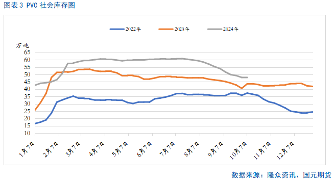 从库存来看,8月至今,虽然PVC社会库存高位去化,但由于需求乏力,导致库存的绝对值仍然处于近几年同期较高位置。截至10月4日,国内PVC社会库存量在48.21万吨,环比上涨0.6%,同比增长10.6%。