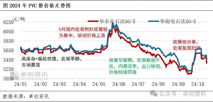 今年PVC粉市场运行逻辑相对清晰,PVC粉自身供大于求的弱基本面以及估值成为市场交易的主要逻辑,所以PVC粉全年的运行基调相对偏弱。但作为期货品种,PVC粉的运行也阶段性受到宏观政策影响。具体来看,5月下旬PVC粉价格出现一波上涨,主要是因为5月中下旬超长期特别国债发行及房地产利好政策出台对商品市场氛围有所支撑,市场情绪好转,PVC粉价格强势上涨,但随着前期政策利好出尽,市场回落整理。同样9月下旬PVC粉出现低位反弹,主要支撑亦来自宏观面,国内降低存款准备金率和政策利率,并带动市场基准利率下行;降低存量房贷利率等。政策“组合拳”的影响下,国内商品氛围好转,PVC粉期现货止跌上涨,但随着宏观情绪消化,市场回归基本面逻辑。