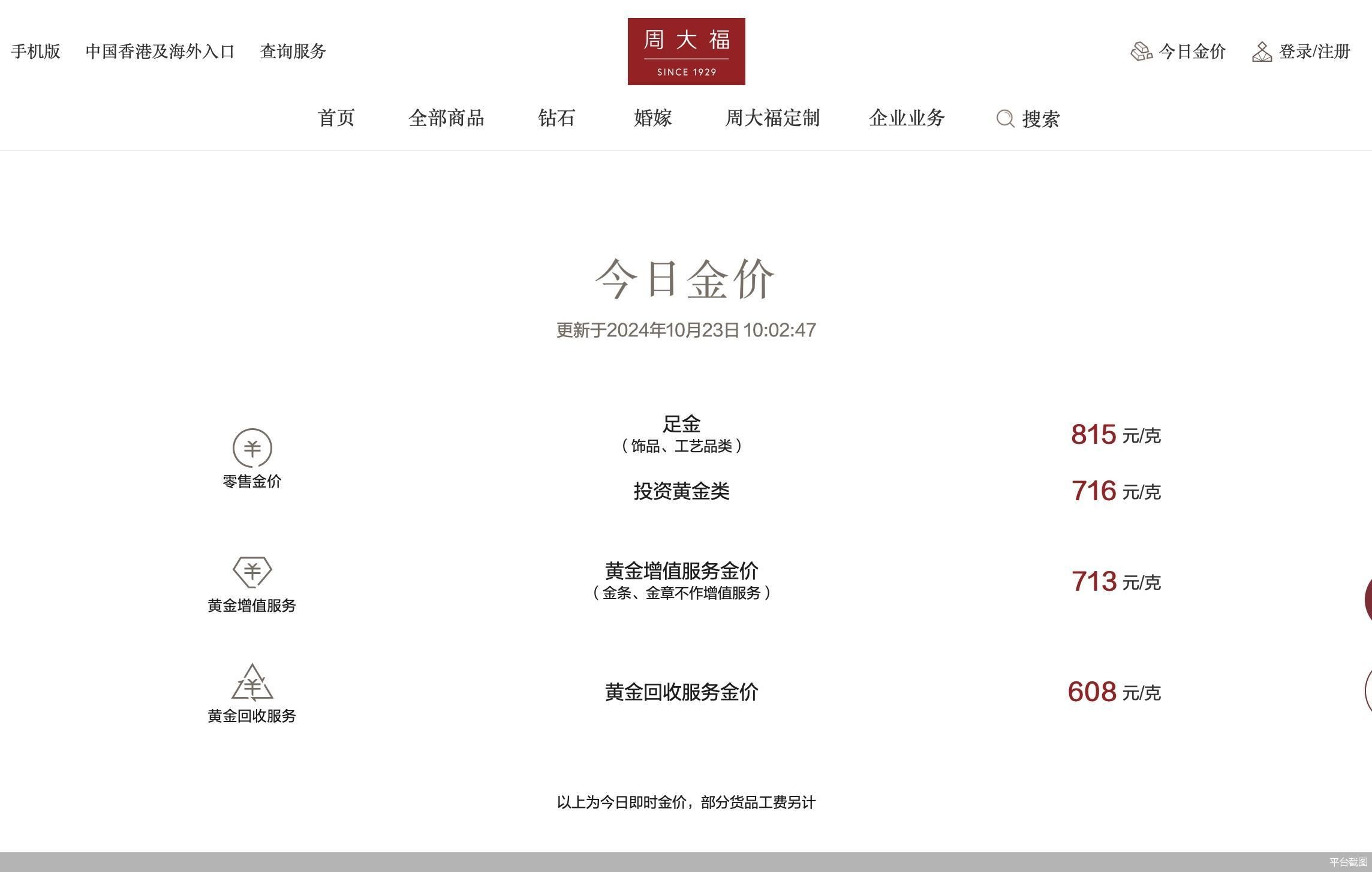 黄金饰品的价格正一路“狂飙”。10月23日,北京商报记者走访线下黄金门店发现,大部分黄金品牌的足金金价已突破800元/克。其中,周大福足金金价达815元/克,投资黄金金价达708元/克;周生生足金金价达812元/克;老庙黄金足金金价也高达813元/克。周大生、中国黄金、菜百首饰等品牌的金价也有着不同程度的增幅。以周大福为例,相较于1月4日足金饰品623元/克的价格,短短不到一年时间,黄金饰品价格已上涨192元/克,涨幅达30.8%,和去年同期相比,涨幅达33.4%。