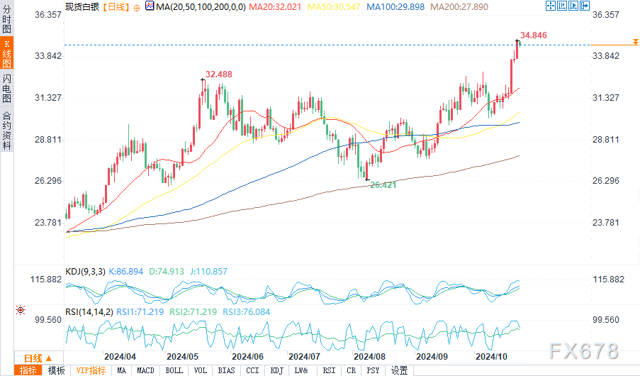 汇通财经APP讯——周三(10月23日)欧盘时段,银价在前一交易日触及34.87美元的多年高点后,周三开始回落。尽管如此,市场仍面临35.40美元的阻力位,需要守住34.35美元的支撑位才能保持上行势头。若未能守住这一支撑位,可能引发获利回吐并推低银价,32.52美元是潜在目标。