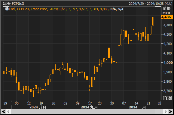 截至2024年10月23日,马来西亚衍生品交易所的1月交割的棕榈油基准合约(FCPOc3)上涨100林吉特,涨幅达2.28%,收于每吨4,486林吉特(约1,031.98美元)。盘中价格一度达到4,514林吉特,这是自2022年7月以来的最高点。此次价格上涨主要受到马来西亚和印尼两大生产国政策变化的推动,再加上对未来棕榈油产量下滑的预期,市场情绪被点燃。