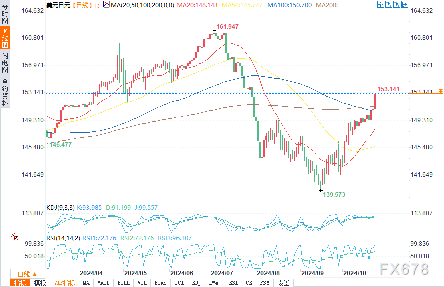 受美元走强和美国国债收益率上升的推动,美元/日元汇率飙升至近三个月高点,触及151.79。美国有利的宏观经济数据,以及对即将到来的美国大选的预期,对避险资产的持续需求,支撑了美元的升值。