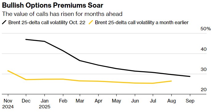 防范油价飙升的措施还体现在石油市场定价期权合约的方式上。近月布伦特看涨期权相对看跌期权的溢价为2022年3月(俄乌战争爆发后不久)以来最大。期权合约也押注未来几个月溢价延续,表明交易员目前预计供应将面临长期威胁。