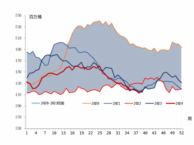 图10:美国近五年原油商业库存(百万桶) | 图11:美国近五年汽油库存(百万桶) |