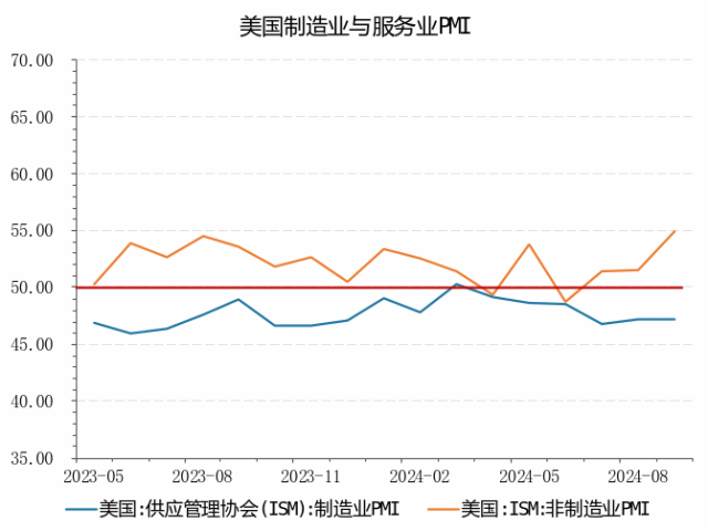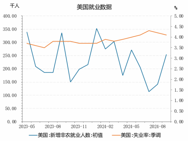美联储在9月19日的会议上决定降息50个基点,这是自2020年3月以来的首次降息,将联邦基金利率目标区间降至4.75%至5%。美联储官员们对2024年的GDP增长预期从2.1%下调至2%,预计未来三年的增长将保持在这个水平,而失业率预期则从4%上调至4.4%。同时,对今明两年的PCE通胀和核心PCE通胀预期也有所下调。美联储的政策声明中表示并将最大化就业作为优先目标。具体来看经济数据方面,美国9月的服务业PMI上升至54.9,创2023年2月以来的新高,而制造业PMI则保持在47.2,较为疲软。最新的就业数据显示,美国劳动力市场依然强劲。9月新增非农就业人数大幅上升至25.4万,失业率下降至4.1%,平均时薪同比增长4%,显示出劳动力市场的韧性。这些经济数据指标增强了市场对美国经济软着陆的预期。