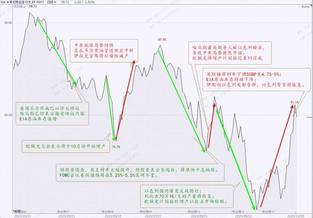 三季度原油整体呈现震荡下行的走势。7月份有两个比较典型的事件发生,第一个是特朗普遇袭导致其支持率大幅飙升,加之特朗普一直主张的平息地缘局势与增加页岩油产量的政策,原油市场开始持续走低。第二个值得关注的则是7月份的降息预期落空,美联储维持5.25%-5.5%的利率区间不变,导致布伦特原油在8月份一整月维持在78美元/桶附近徘徊,在8月份原油受到哈马斯领导人被以色列暗杀以及利比亚油田停产这两则消息的刺激,有小幅反弹,但均未突破82美元/桶的价位,反弹力度一次比一次小。9月份则随着炼厂季节性检修的开始,以色列国内爆发大规模的反战游行,利比亚油田70万桶/天原油产量的恢复,以及沙特不愿继续延长增产时间节点等利空因素的影响,油价再度出现下跌行情,一度跌至68美元/桶附近,一直到10月初中东地缘局势的升级,原油才出现一波较为强劲的反弹行情。