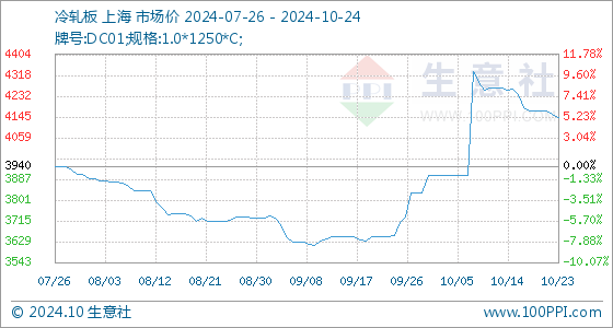 10月24日,生意社冷轧板基准价为4145.00元/吨,与本月初(3905.00元/吨)相比,上涨了6.15%。