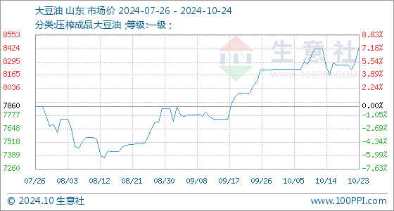 10月24日,生意社大豆油基准价为8446.00元/吨,与本月初(8224.00元/吨)相比,上涨了2.70%。