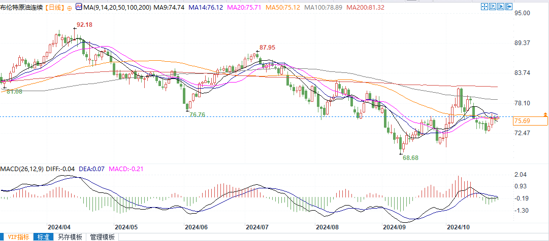 北京时间10月24日10:10,布伦特原油价格报75.70美元/桶