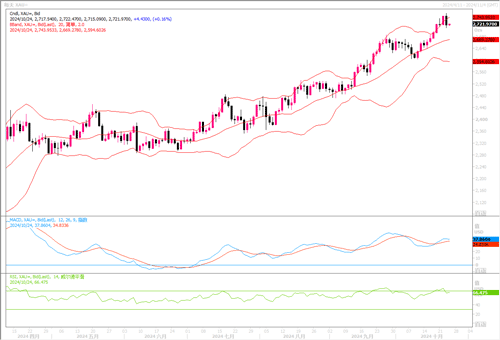 周三的金融市场上,由于美国总统大选前的对冲活动,以及对美联储未来几个月料不会积极降息的押注,美债收益率飙升,指标美国10年期公债收益率上升3.4个基点至4.24%,此前曾触及三个月高位4.26%。而美元指数也触及两个半月高位。这导致现货黄金高位出现获利回吐调整性回落。目前需关注的焦点要放在还有两周就要揭晓的美国大选上。两党候选人选情民调仍呈胶着状态,此前曾传出共和党特朗普胜出面大。若特朗普胜出,其推行的加征关税策略,被认为将会再度推高通胀,而且将造成美元继续走强。如果市场预计哈里斯获胜,考虑到她的政策被认为通胀效应较小,美元和收益率可能会有所回调,则有利于黄金。在美国大选结果揭晓之前,政治消息面的变动短期内将会对黄金产生较大的影响。