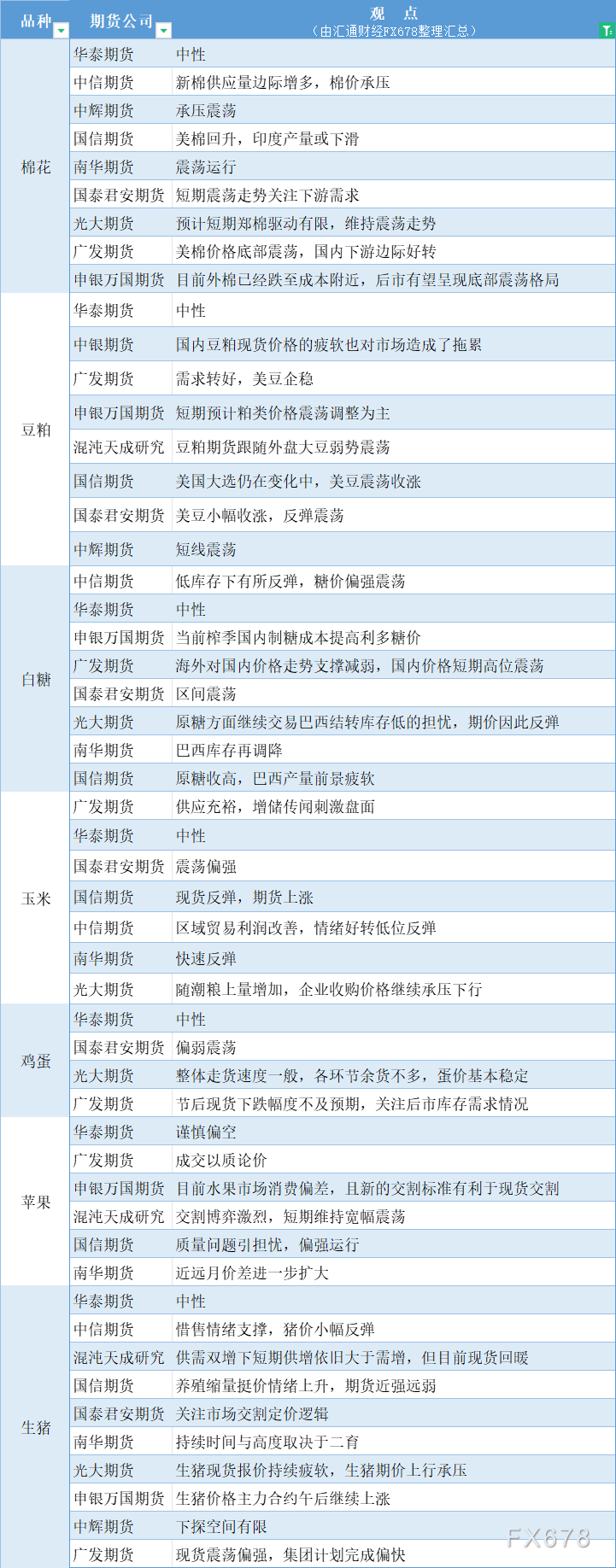 汇通财经APP讯——期货公司观点汇总一张图:10月24日农产品(棉花、豆粕、白糖、玉米、鸡蛋、生猪等)